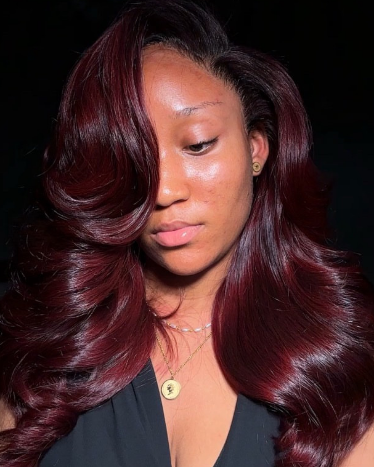 There is a warmth and depth to women who wear Burgundy Bliss, like their presence carries quiet intensity whether they are at a chic dinner, a cocktail event, or a late-night date. The rich burgundy waves move with fullness and drama, wrapping around you in a way that feels bold, feminine, and undeniably magnetic in a boardroom, at a gallery opening, or even on a glamorous night out.