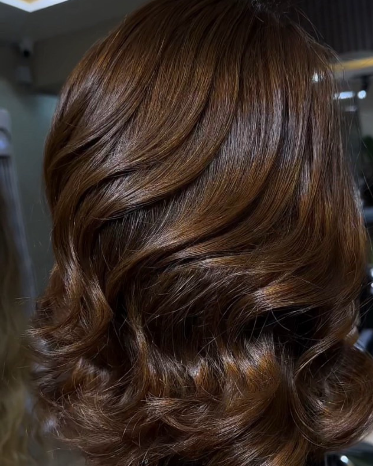 She moves through her day with quiet ease, looking polished without trying too hard, and Olivia complements that energy perfectly. The soft brunette waves and gentle face-framing layers fall with natural grace, giving her a warm, refined, and effortlessly put-together look.